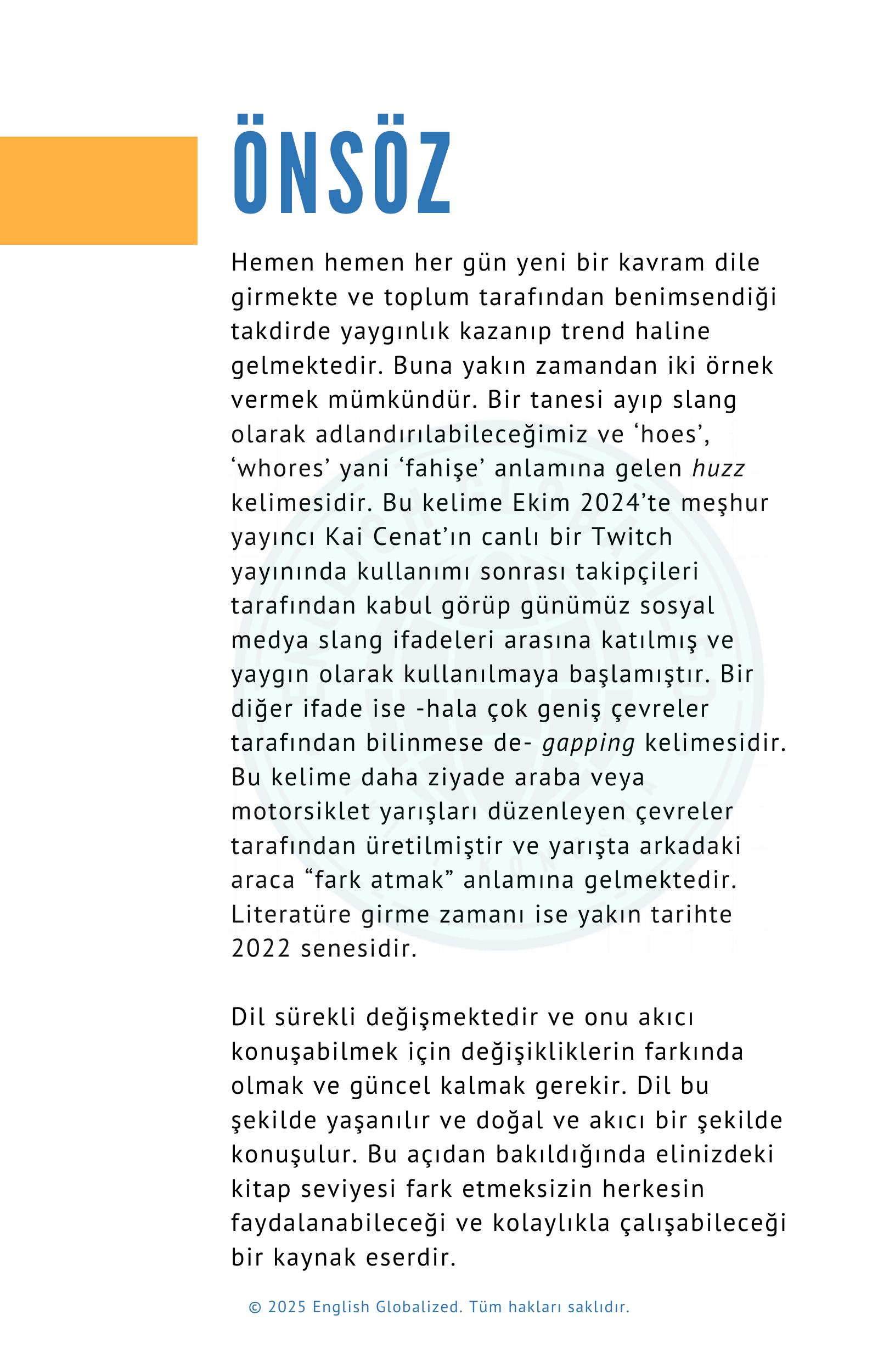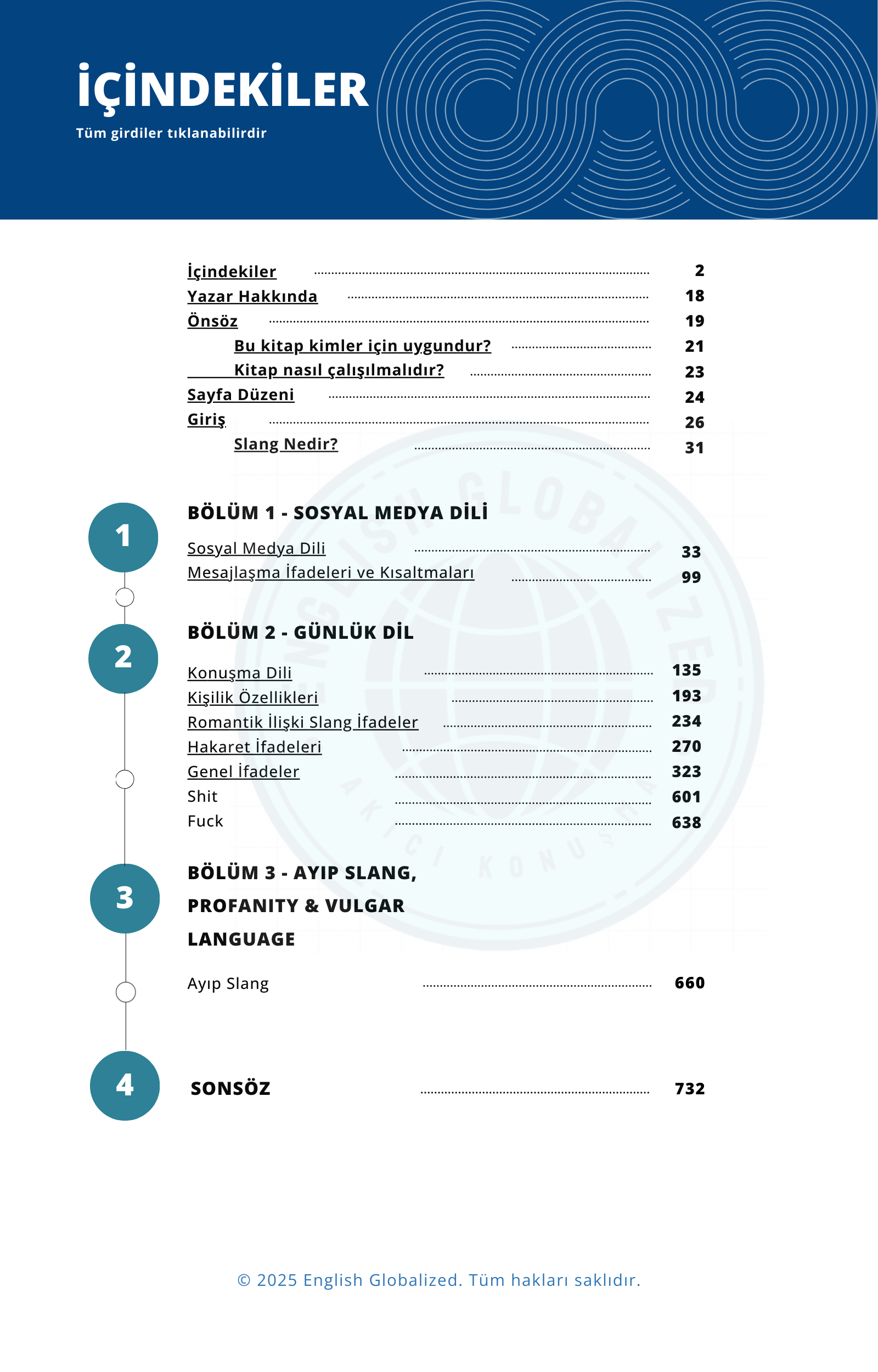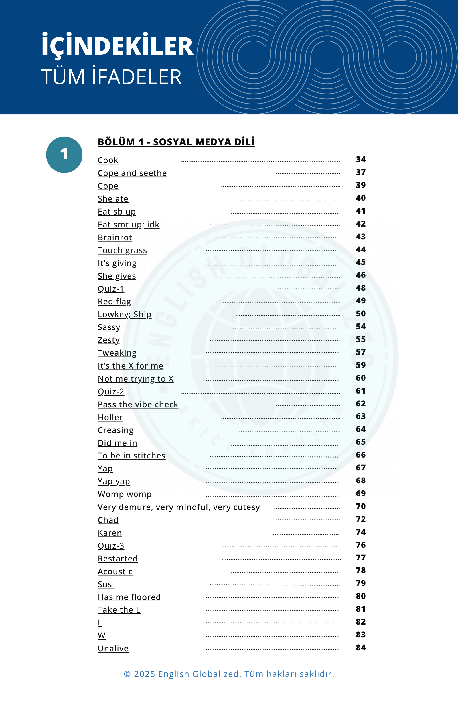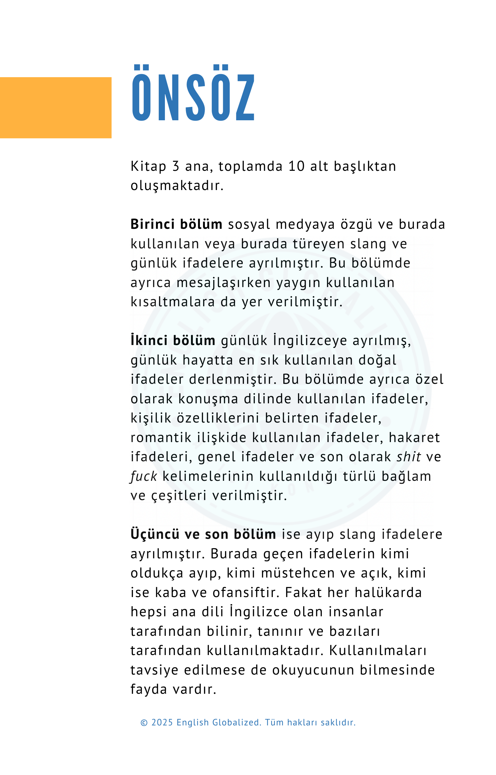 Birinci bölüm sosyal medyaya özgü ve burada kullanılan veya burada türeyen slang ve günlük ifadelere ayrılmıştır. Bu bölümde ayrıca mesajlaşırken yaygın kullanılan kısaltmalara da yer verilmiştir.