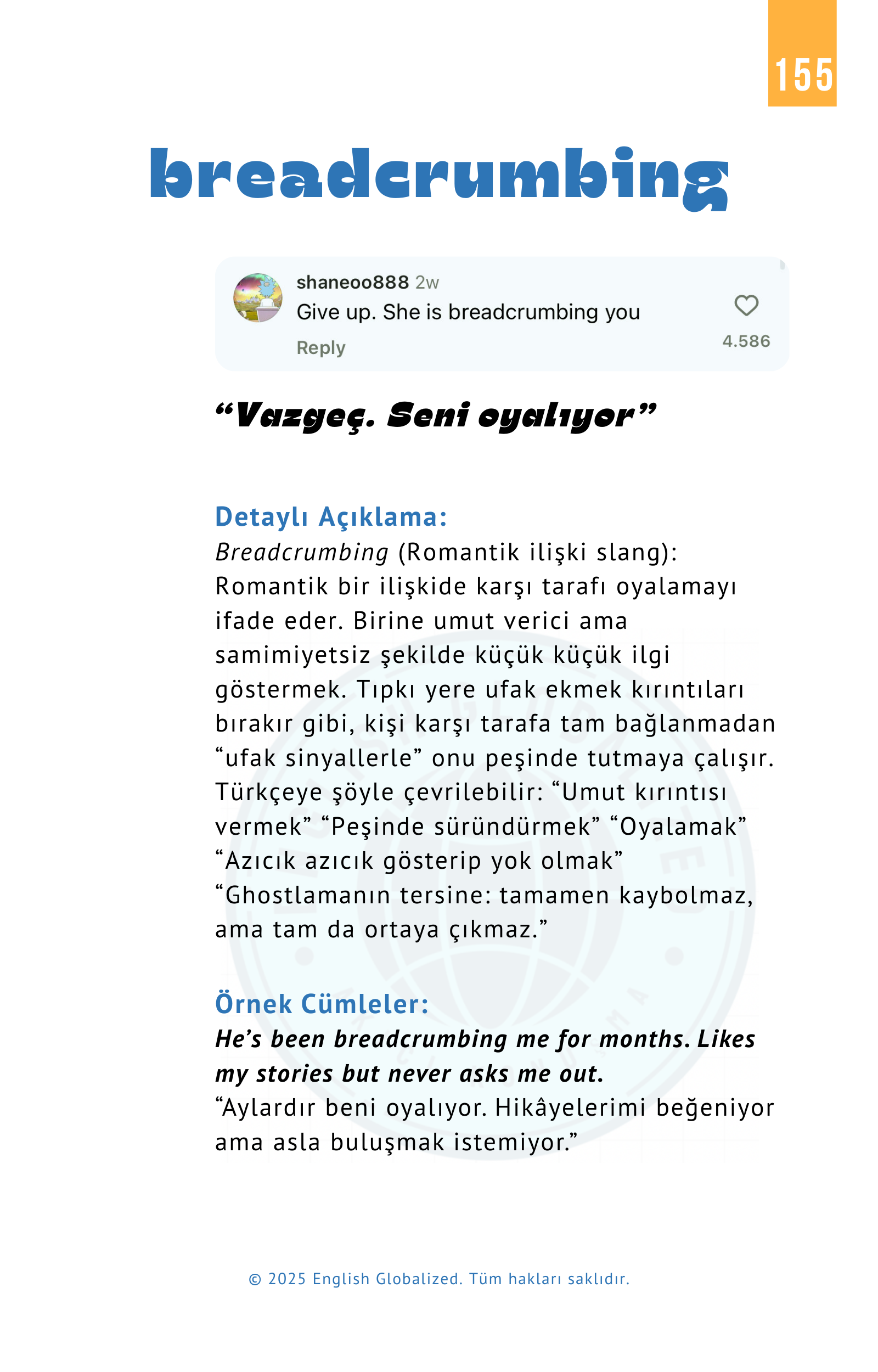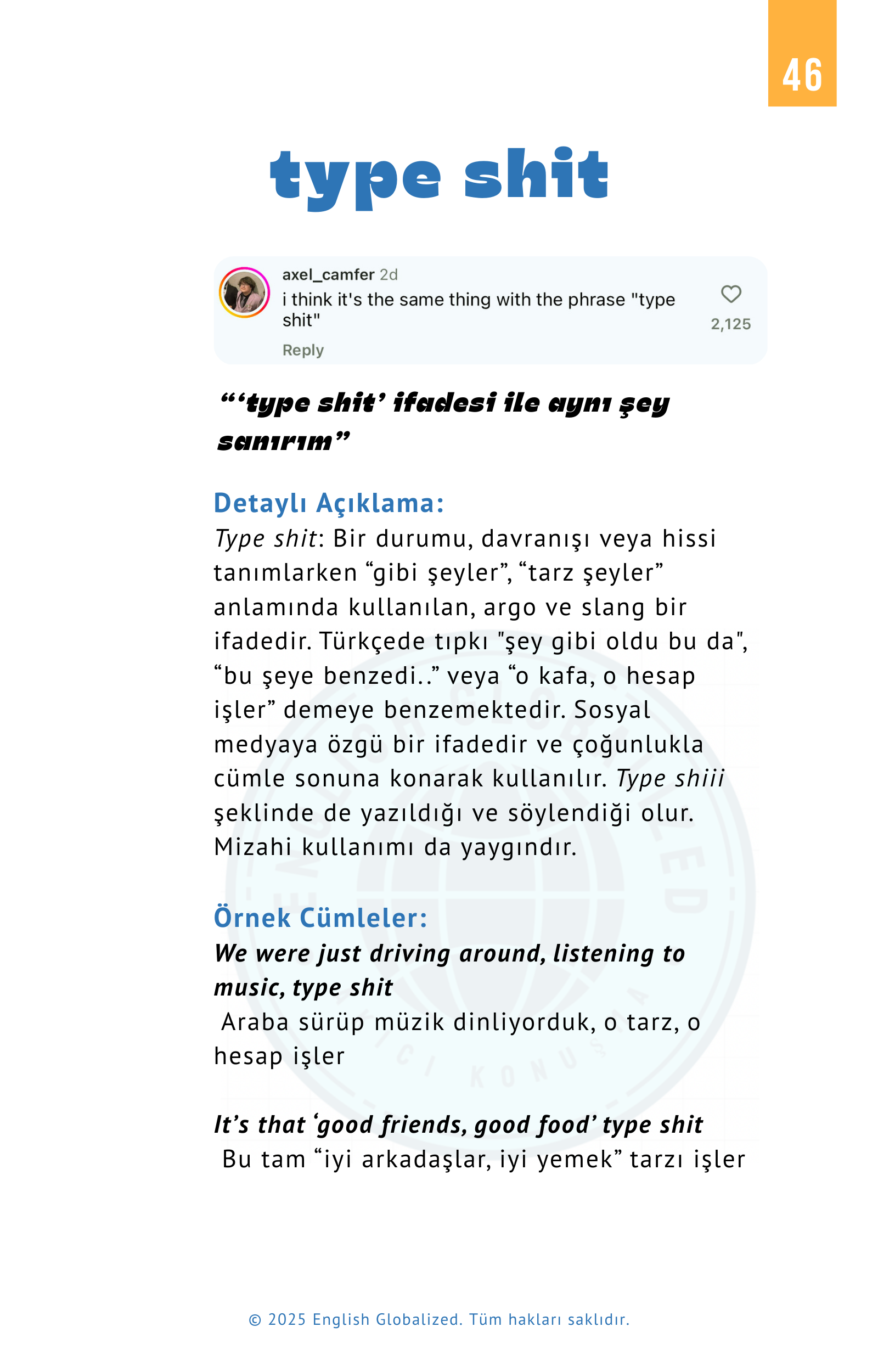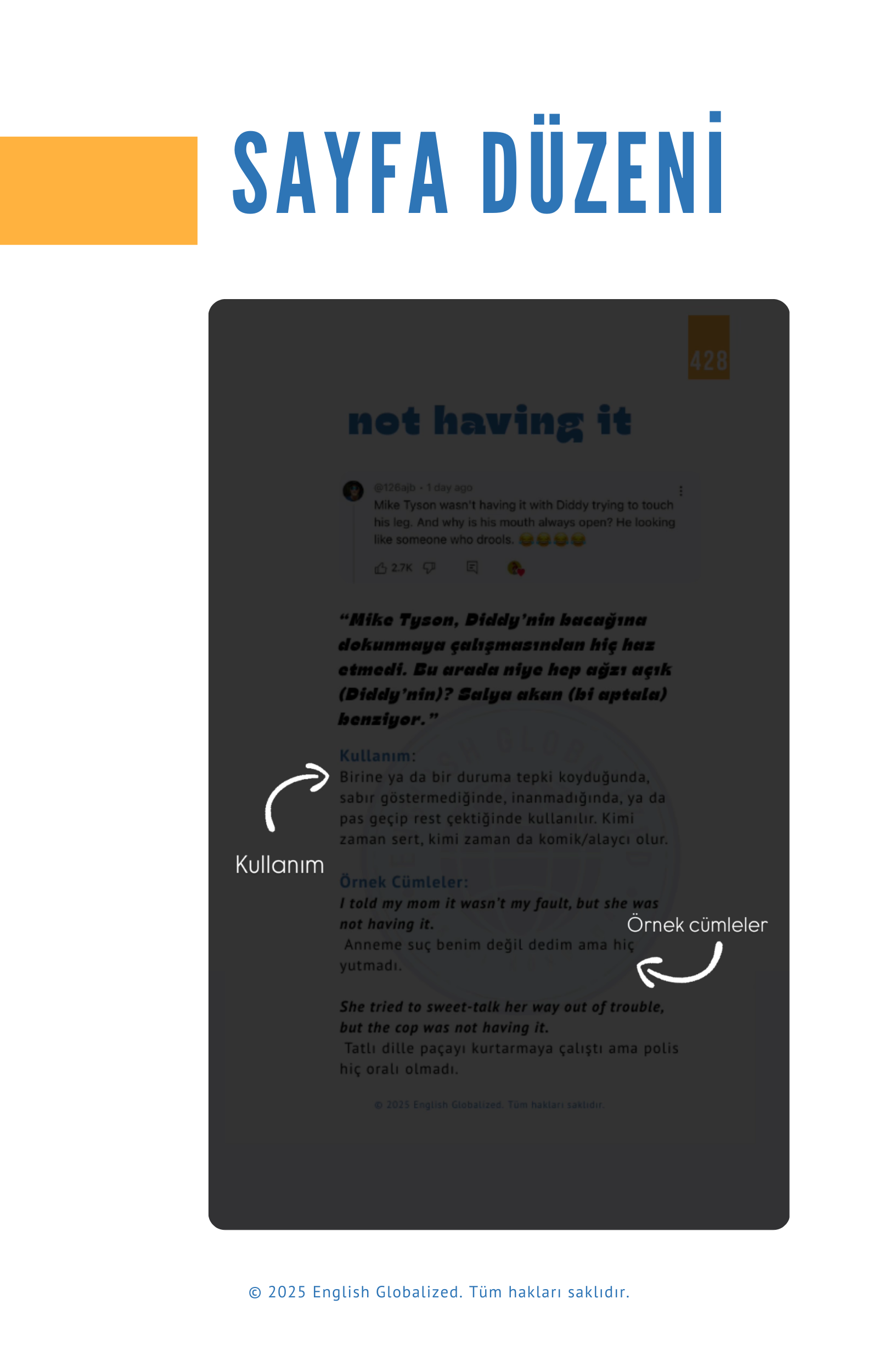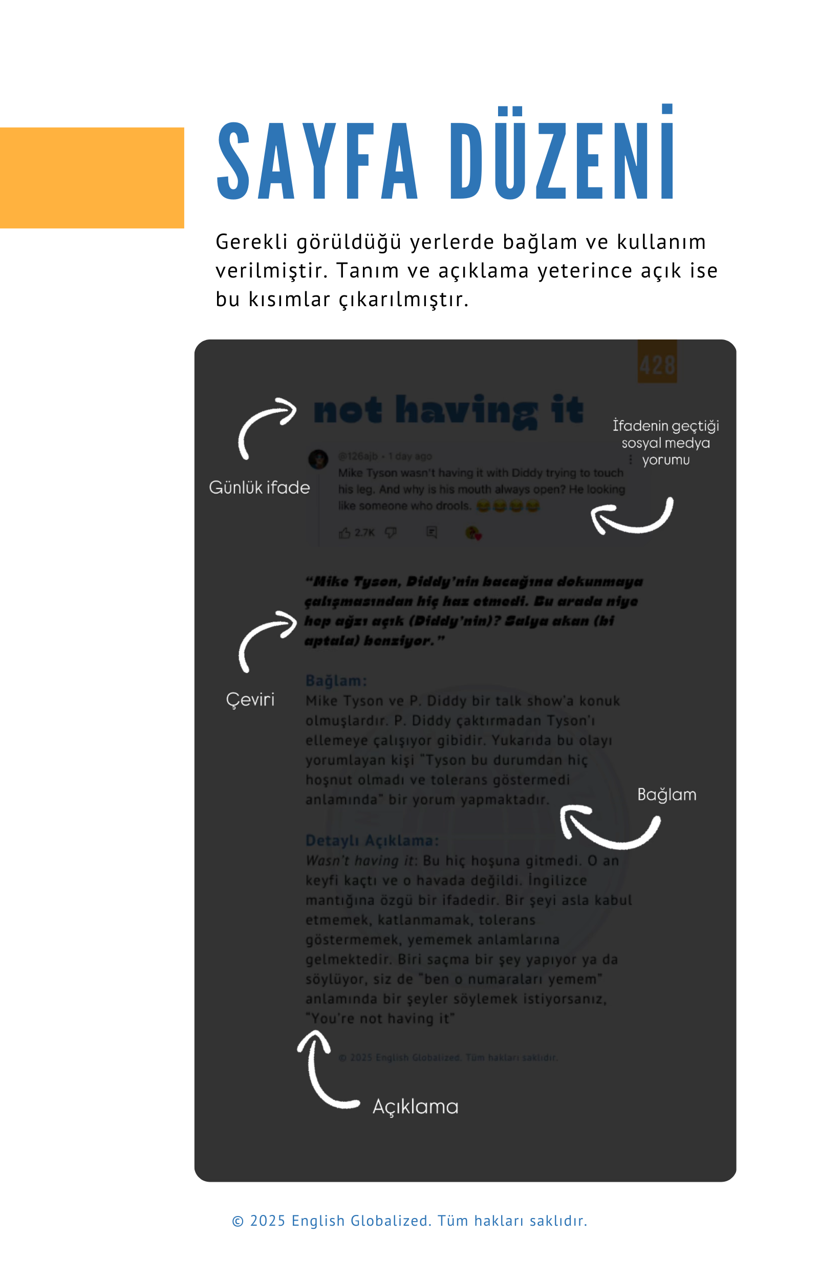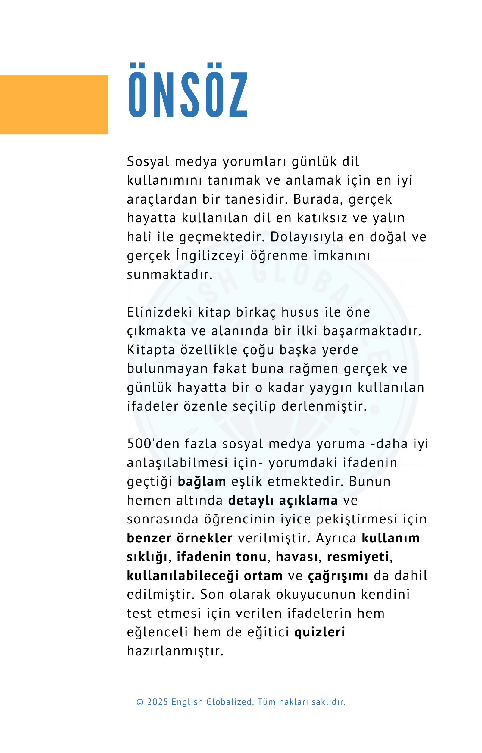 Birinci bölüm sosyal medyaya özgü ve burada kullanılan veya burada türeyen slang ve günlük ifadelere ayrılmıştır. Bu bölümde ayrıca mesajlaşırken yaygın kullanılan kısaltmalara da yer verilmiştir.