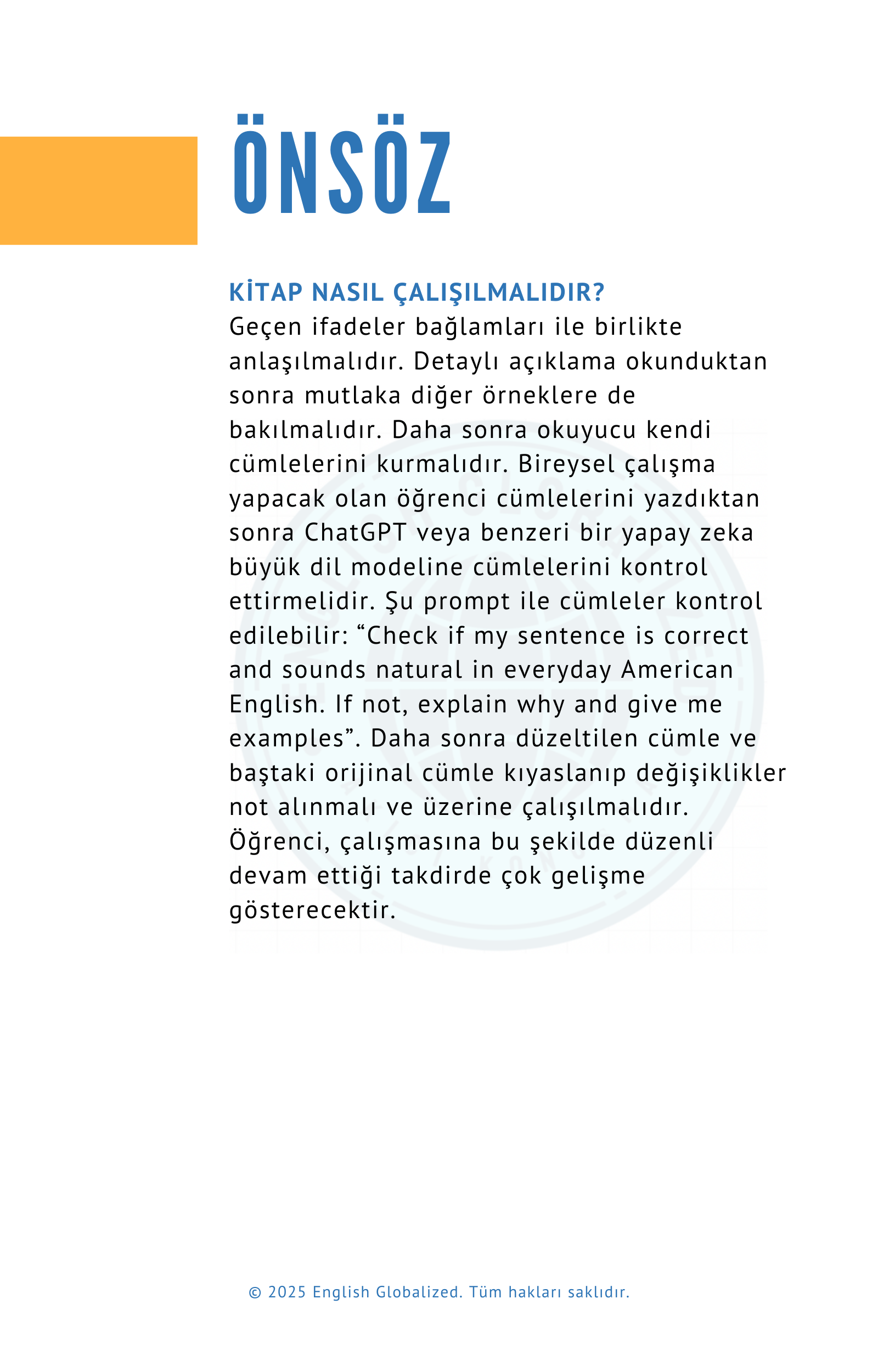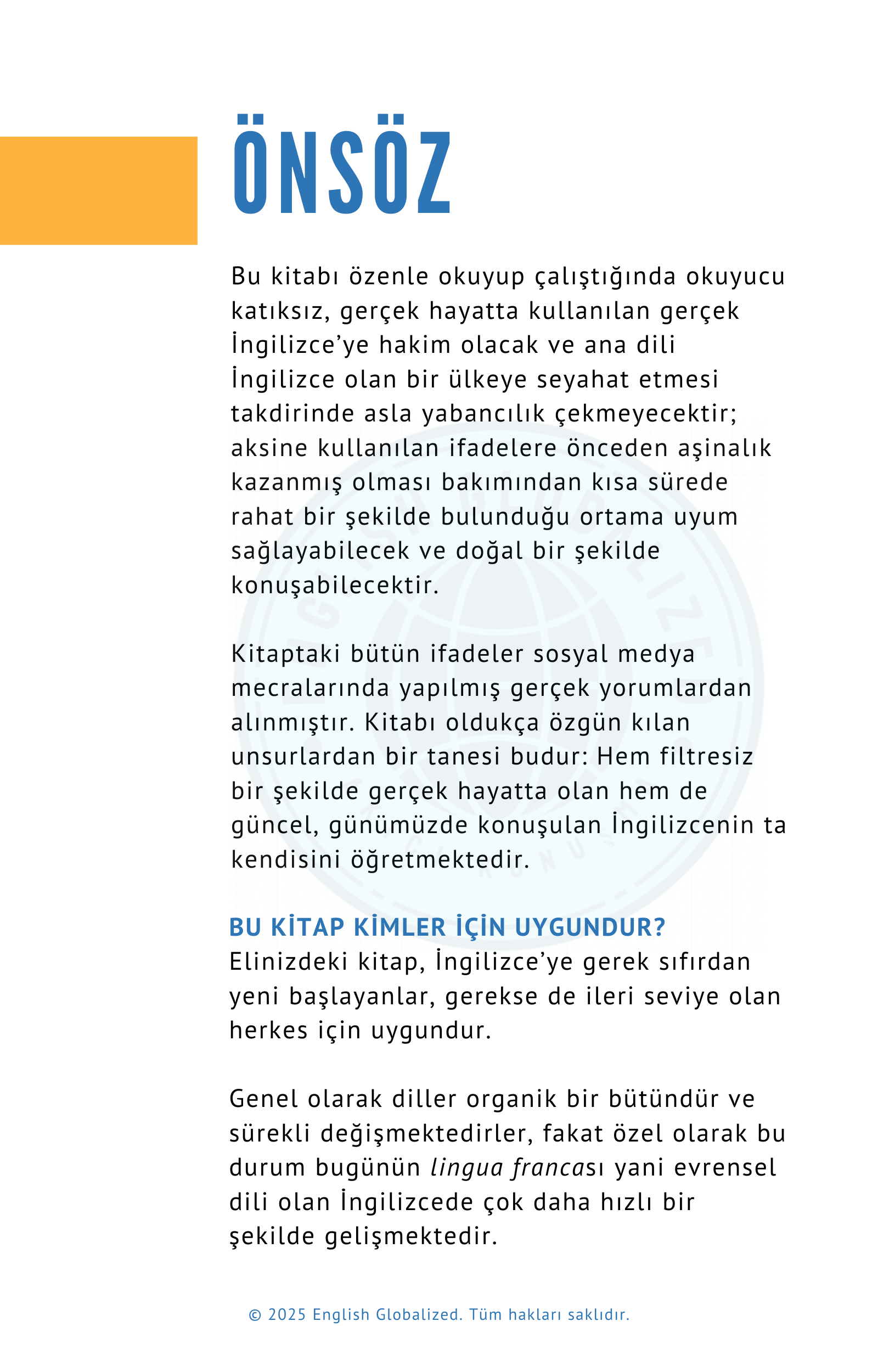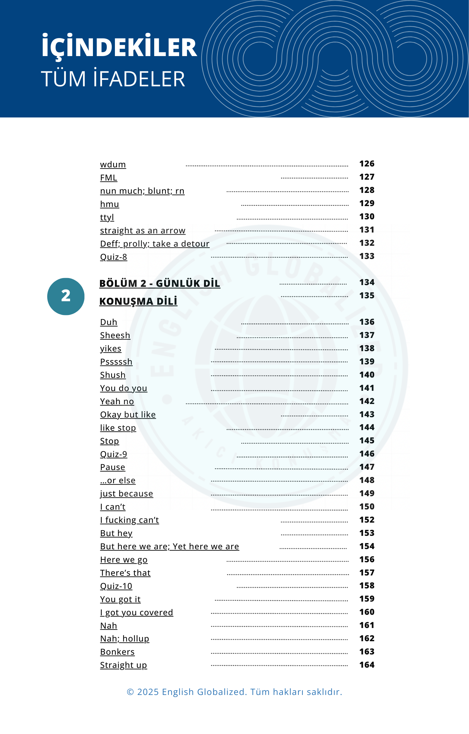 İkinci bölüm günlük İngilizceye ayrılmış, günlük hayatta en sık kullanılan doğal ifadeler derlenmiştir. Bu bölümde ayrıca özel olarak konuşma dilinde kullanılan ifadeler, kişilik özelliklerini belirten ifadeler, romantik ilişkide kullanılan ifadeler, hakaret ifadeleri, genel ifadeler ve son olarak shit ve fuck kelimelerinin kullanıldığı türlü bağlam ve çeşitleri verilmiştir.